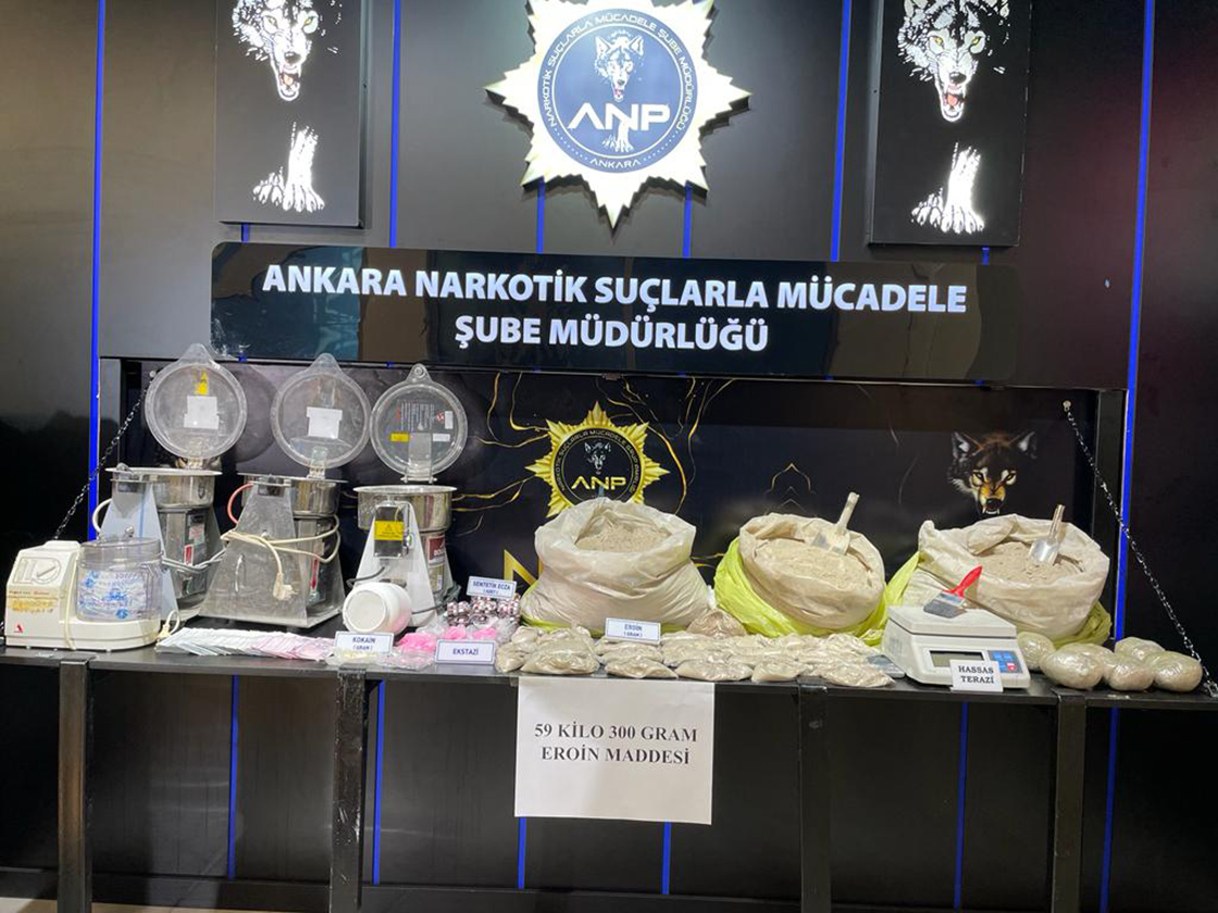 Ankara merkezli 5 ilde öel harekat polisleri desteğinde 6 ayrı uyuşturucu grubuna yönelik 106 farklı noktaya 150 ekiple yapılan operasyonda, 60 kilogram eroin ve çeşitli uyuşturucu maddeler ele geçirildi.